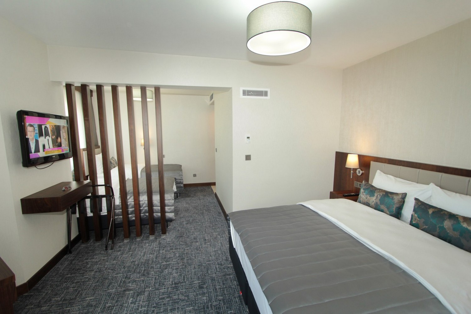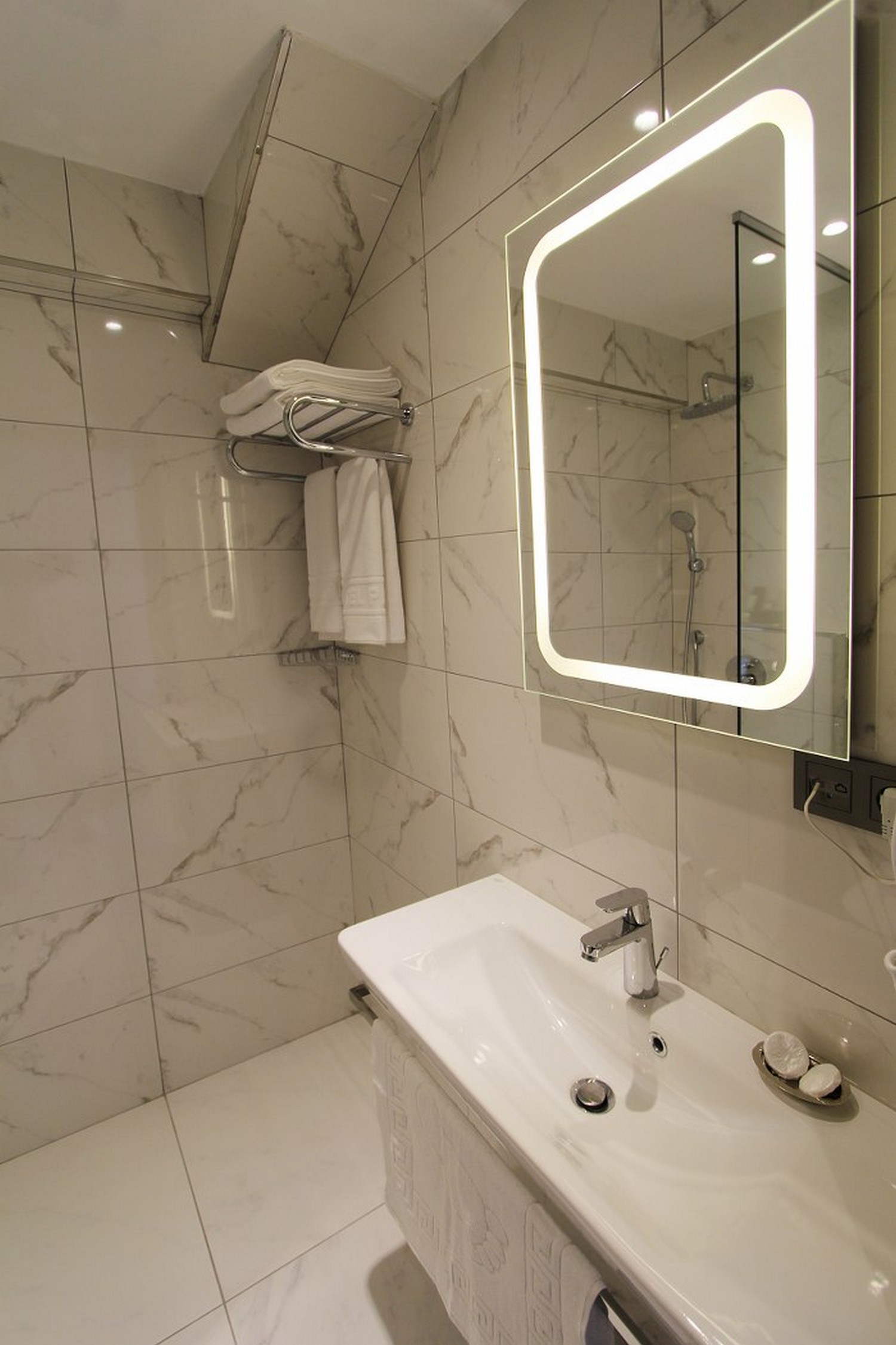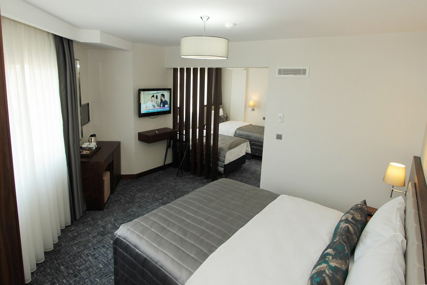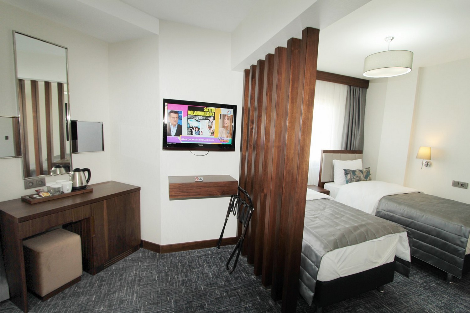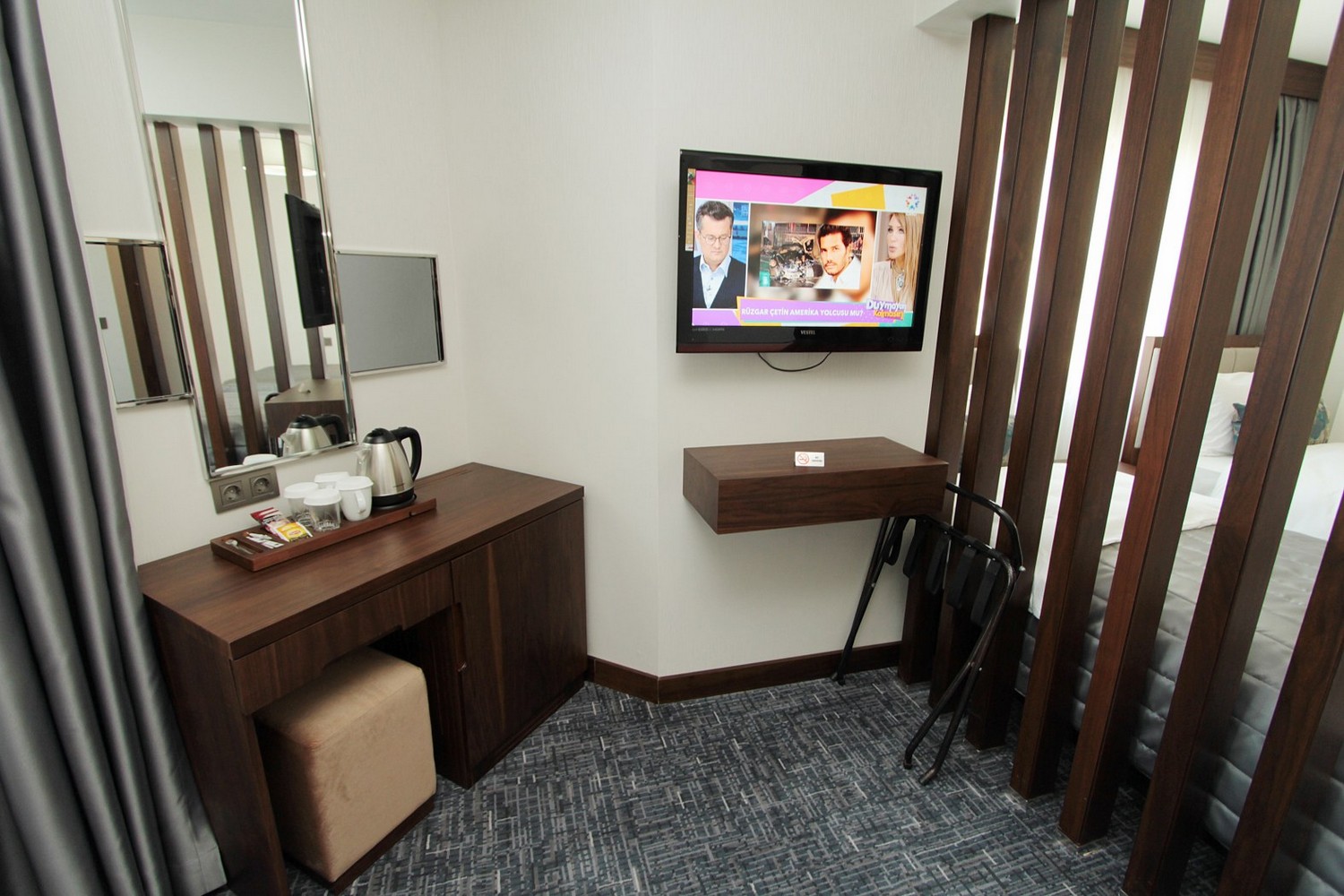 The comfortable and spacious room has a large screen android TV. In addition to the tea/coffee set, there are free toiletries in the room.